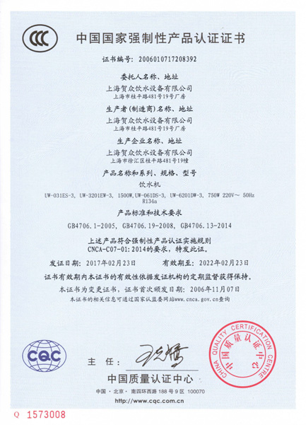 東莞市賀一飲水設備有限公司為賀眾牌飲水設備東莞授權總代理商,證號24019,負責上海賀眾飲水設備所產制的賀眾牌相關產品的銷售以及售后服務。
